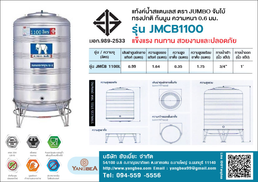 คุณสมบัติ แท้งค์น้ําสแตนเลสตราช้าง(JUMBO)จัมโบ้ ก้นนูน 1100 ลิตร รุ่น JMCB1100