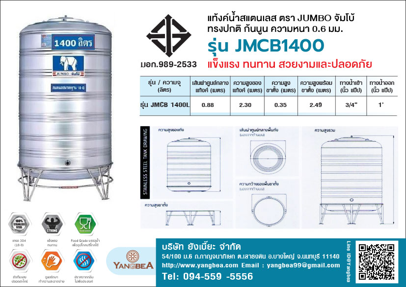 คุณสมบัติ แท้งค์น้ําสแตนเลสตราช้าง(JUMBO)จัมโบ้ ก้นนูน 1400 ลิตร รุ่น JMCB1400