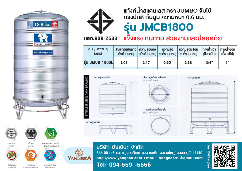 คุณสมบัติ แท้งค์น้ําสแตนเลสตราช้าง(JUMBO)จัมโบ้ ก้นนูน 1800 ลิตร รุ่น JMCB1800