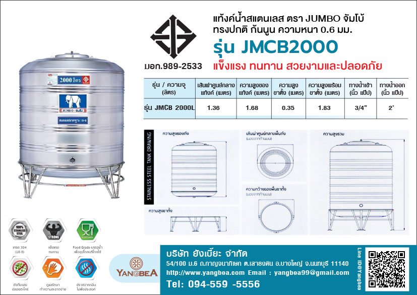 411คุณสมบัติ แท้งค์น้ําสแตนเลสตราช้าง(JUMBO)จัมโบ้ ก้นนูน 2000 ลิตร รุ่น JMCB2000