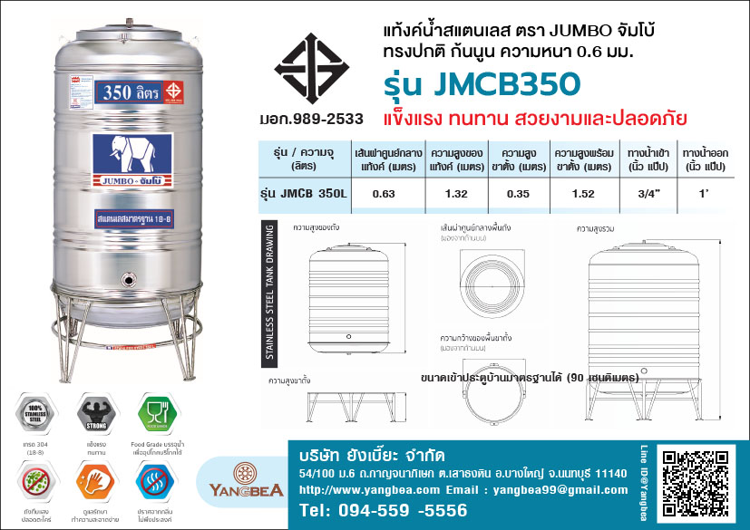 คุณสมบัติ แท้งค์น้ําสแตนเลสตราช้าง(JUMBO)จัมโบ้ ก้นนูน 350 ลิตร รุ่น JMCB350