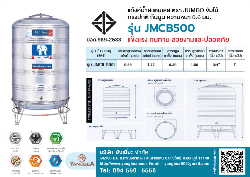 คุณสมบัติ แท้งค์น้ําสแตนเลสตราช้าง(JUMBO)จัมโบ้ ก้นนูน 500 ลิตร รุ่น JMCB500