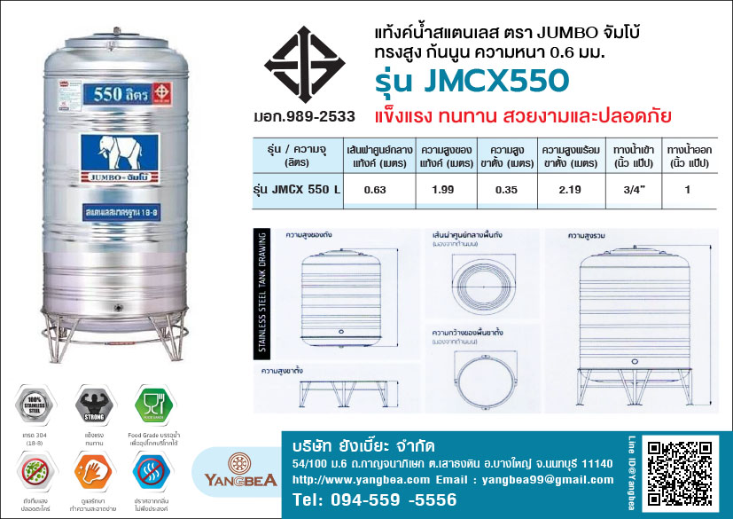 คุณสมบัติ แท้งค์น้ําสแตนเลสตราช้าง(JUMBO)จัมโบ้ ก้นนูน 550 ลิตร รุ่น JMCX550