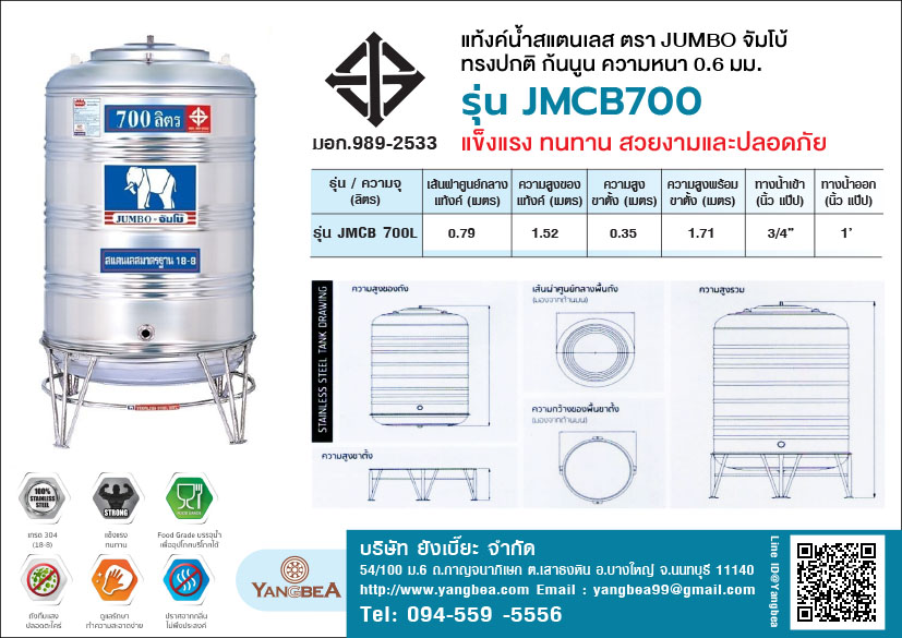 คุณสมบัติ แท้งค์น้ําสแตนเลสตราช้าง(JUMBO)จัมโบ้ ก้นนูน 700 ลิตร รุ่น JMCB700