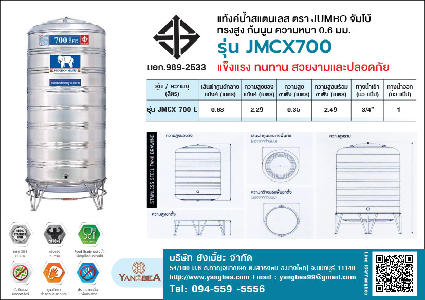คุณสมบัติ แท้งค์น้ําสแตนเลสตราช้าง(JUMBO)จัมโบ้ ก้นนูน 700 ลิตร รุ่น JMCX700