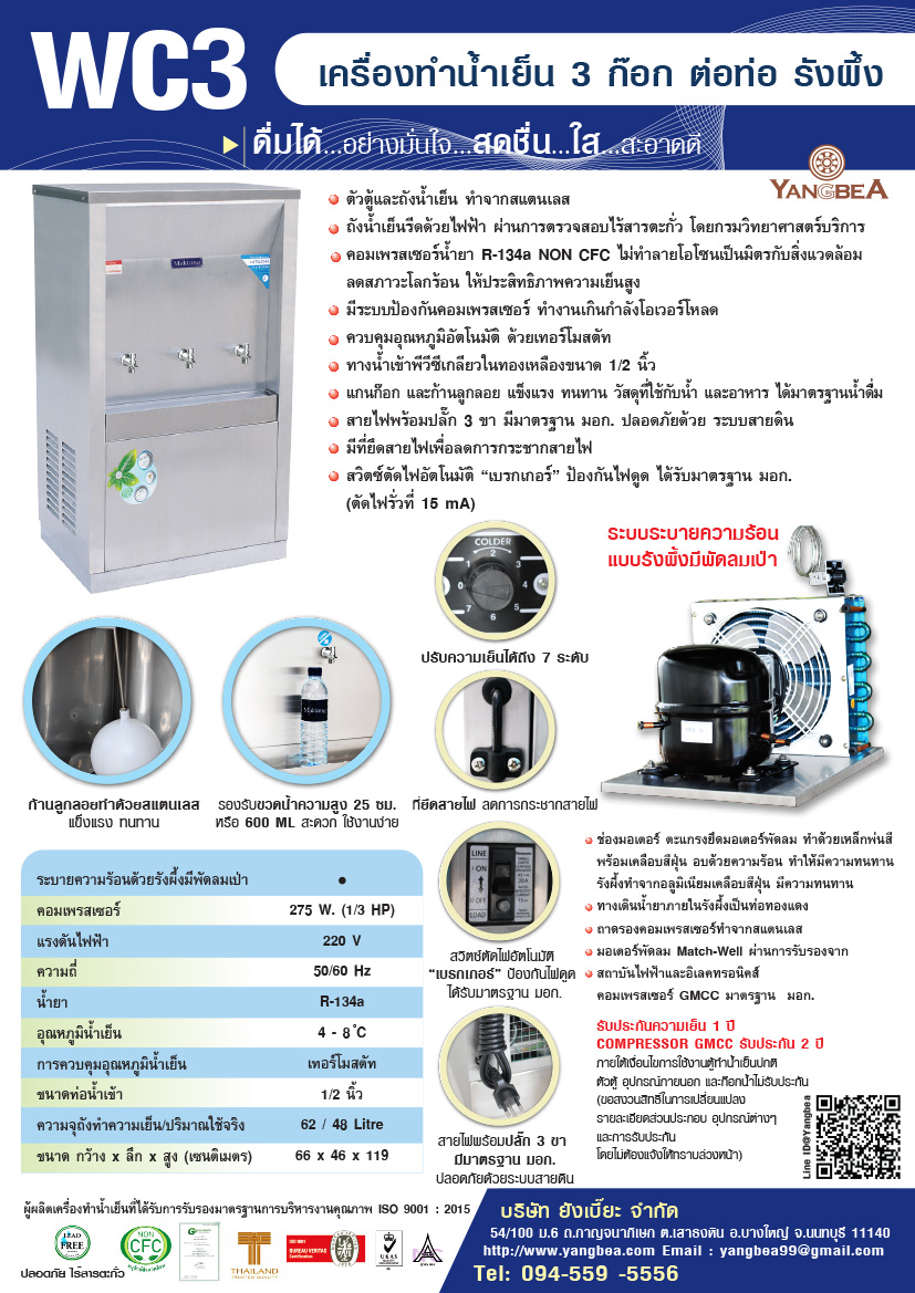 รายละเอียดการสั่งซื้อตู้ทำนํ้าเย็นสแตนเลส 3 ก๊อก WC3 แบบต่อท่อ ระบายความร้อนด้วยพัดลมดูดเป่ารังผึ้ง