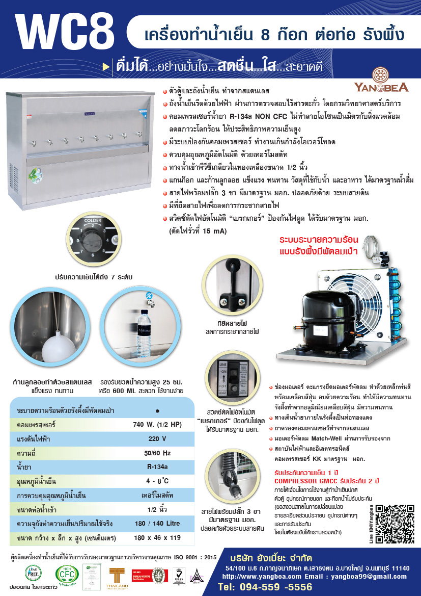การรับประกัน ตู้ทำนํ้าเย็นสแตนเลส 8 ก๊อก WC8 แบบต่อท่อ ระบายความร้อนด้วยพัดลมดูดเป่ารังผึ้ง รับประกันความเย็น 1 ปี COMPRESSOR KK รับประกัน 1 ปี