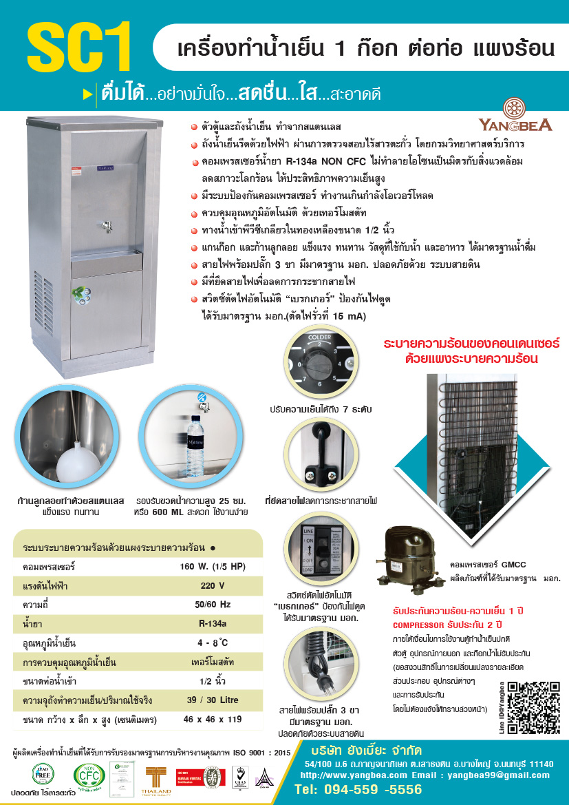 รายละเอียด ตู้ทำนํ้าเย็นสแตนเลส 1 ก๊อก SC1 แบบต่อท่อ ระบายความร้อนด้วยแผงระบายความ