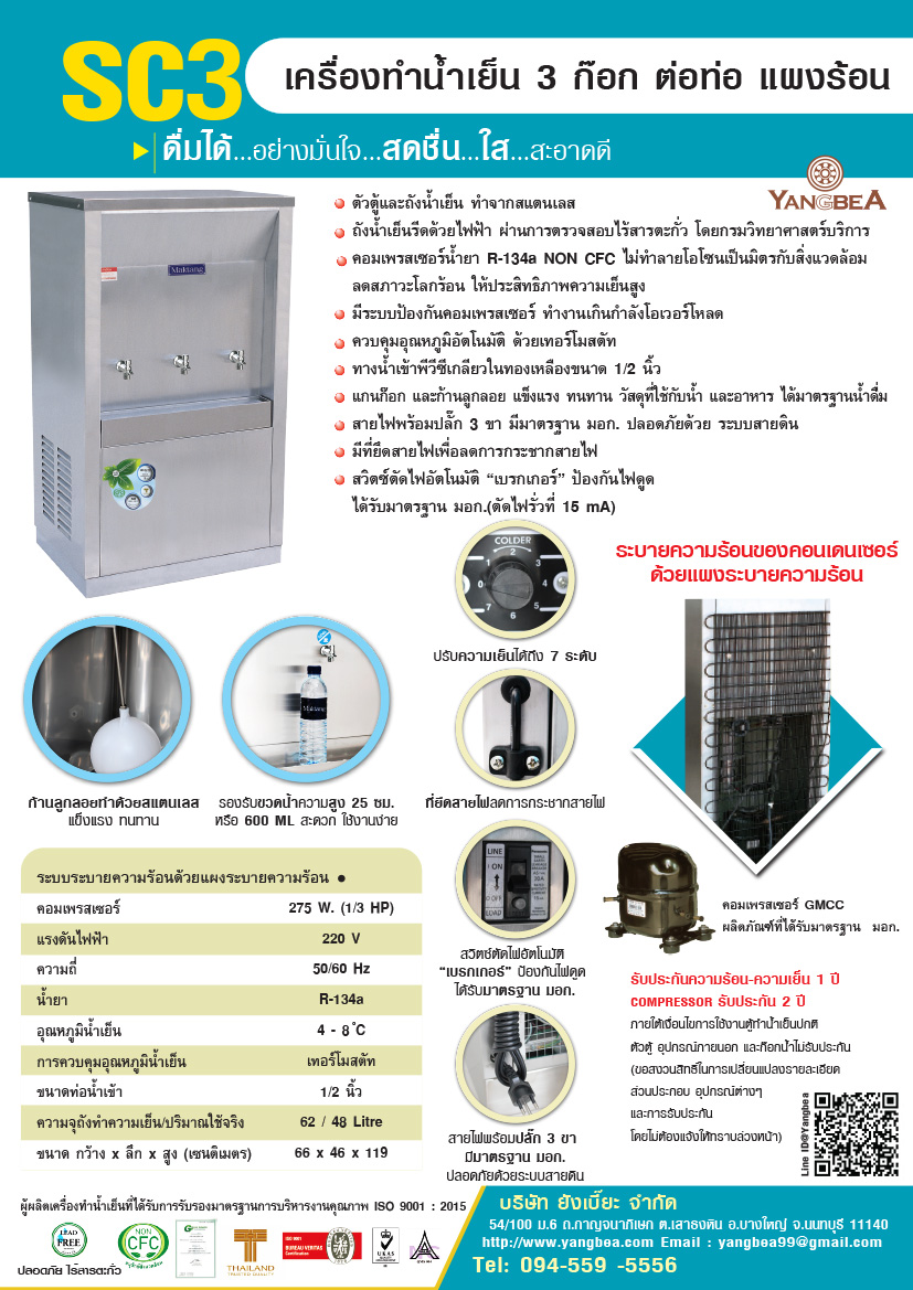 รายละเอียด ตู้ทำนํ้าเย็นสแตนเลส 3 ก๊อก SC3 แบบต่อท่อ ระบายความร้อนด้วยแผงระบายความร้อน