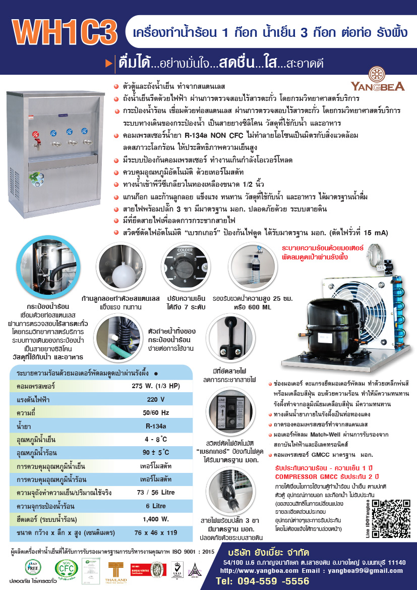 รายละเอียดการสั่งซื้อตู้ทำนํ้าร้อน น้ำเย็น WH1C3 (น้ำร้อน 1ก๊อก น้ำเย็น 3ก๊อก) สแตนเลส แบบต่อท่อ ระบายความร้อนด้วยพัดลมดูดเป่ารังผึ้ง