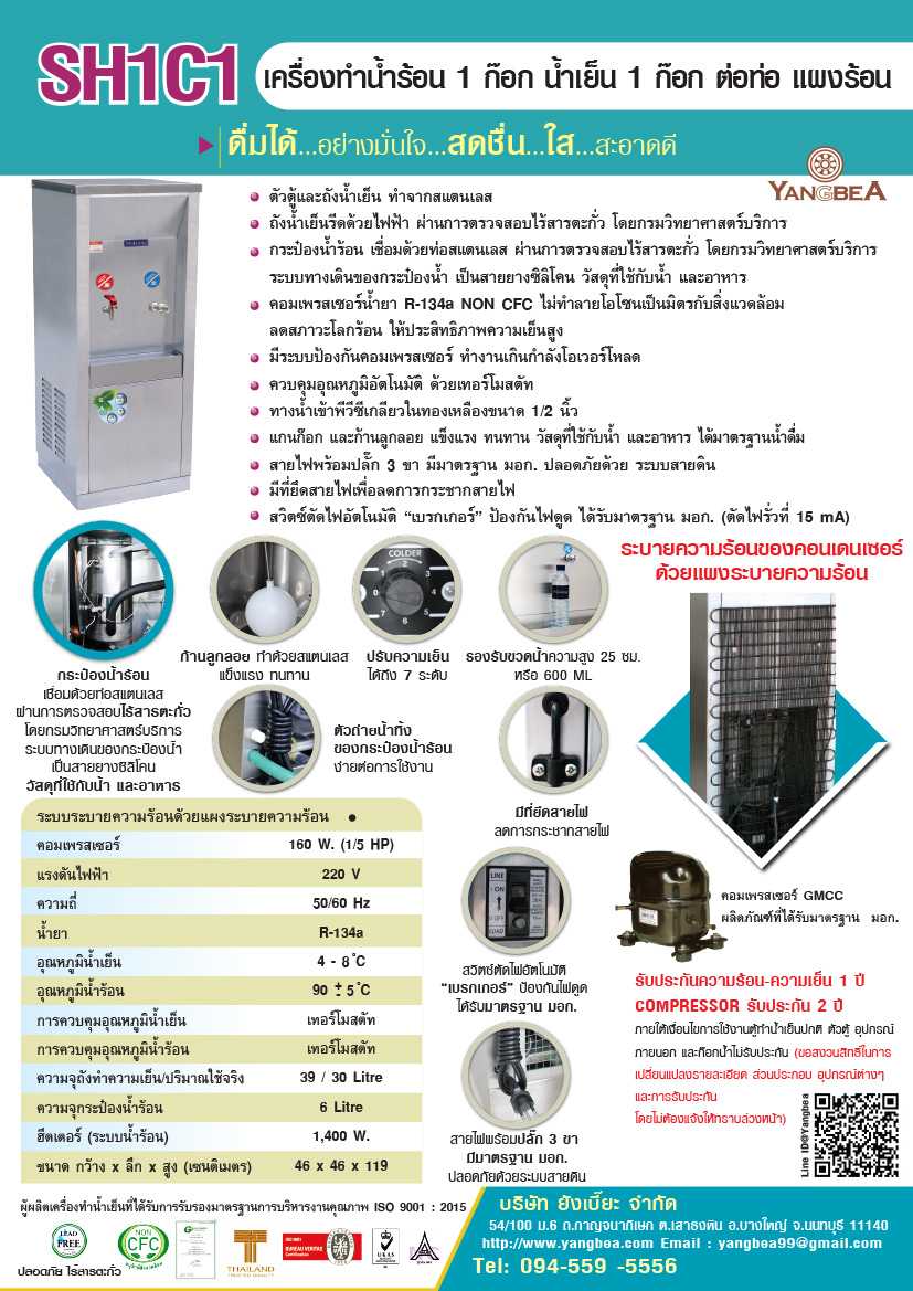 การรับประกัน ตู้ทำนํ้าร้อน น้ำเย็น SH1C1 (น้ำร้อน 1ก๊อก น้ำเย็น 1ก๊อก) สแตนเลส แบบต่อท่อ ระบายความร้อนด้วยแผงระบายความร้อน รับประกันความร้อน ความเย็น 1 ปี COMPRESSOR GMCC รับประกัน 2 ปี