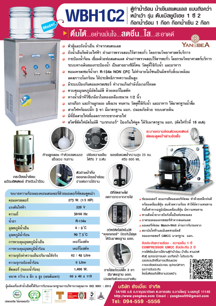รายละเอียดการสั่งซื้อตู้ทำน้ำร้อน น้ำเย็นแบบขวดคว่ำWBH1C2 (น้ำร้อน 1ก๊อก น้ำเย็น 2ก๊อก) สแตนเลส แบบต่อท่อ ระบายความร้อนด้วยพัดลมดูดเป่ารังผึ้ง