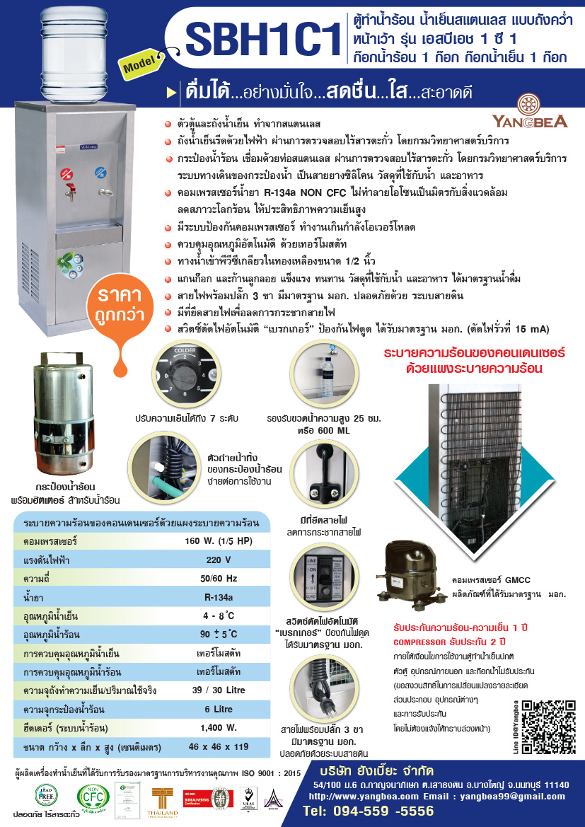 การรับประกัน ตู้ทำน้ำร้อน น้ำเย็นแบบขวดคว่ำ SBH1C1 (น้ำร้อน 1ก๊อก น้ำเย็น 1ก๊อก) สแตนเลส แบบต่อท่อ ระบายความร้อนด้วยแผงระบายความร้อน รับประกันความร้อน ความเย็น 1 ปี COMPRESSOR GMCC รับประกัน 2 ปี