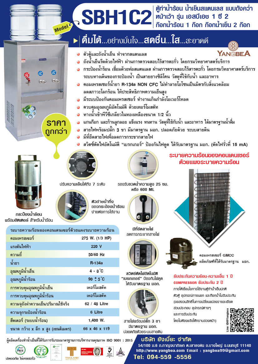 การรับประกัน ตู้ทำน้ำร้อน น้ำเย็นแบบขวดคว่ำ SBH1C2 (น้ำร้อน 1ก๊อก น้ำเย็น 2ก๊อก) สแตนเลส แบบต่อท่อ ระบายความร้อนด้วยแผงระบายความร้อน รับประกันความร้อน ความเย็น 1 ปี COMPRESSOR GMCC รับประกัน 2 ปี