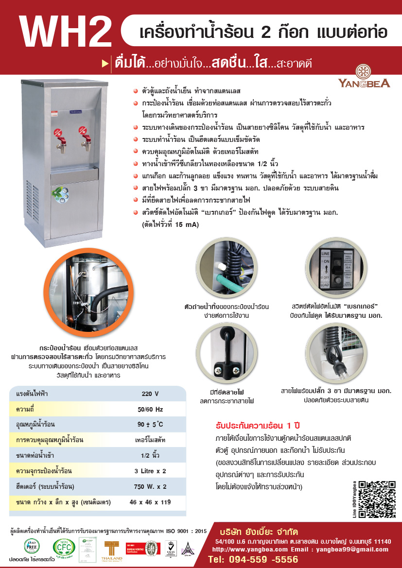การรับประกัน ตู้ทำนํ้าร้อนสแตนเลส 2 ก๊อก แบบต่อท่อ WH2 รับประกันความร้อน 1 ปี