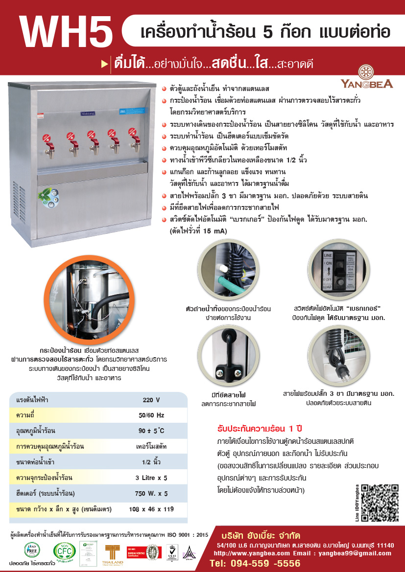 การรับประกัน ตู้ทำนํ้าร้อนสแตนเลส 5 ก๊อก แบบต่อท่อ WH5 รับประกันความร้อน 1 ปี