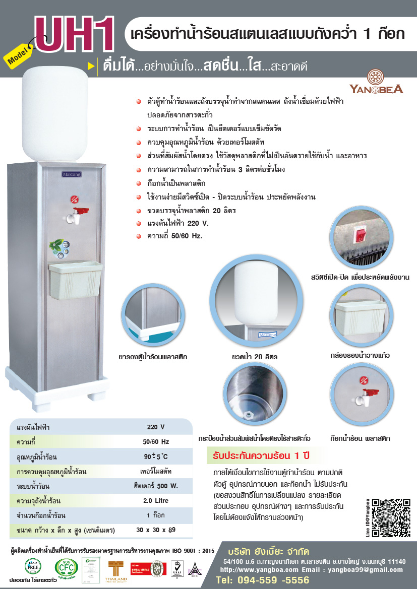 การรับประกัน ตู้น้ำร้อนแบบขวดคว่ำ 1 ก๊อก UH1 รับประกันความร้อน 1 ปี