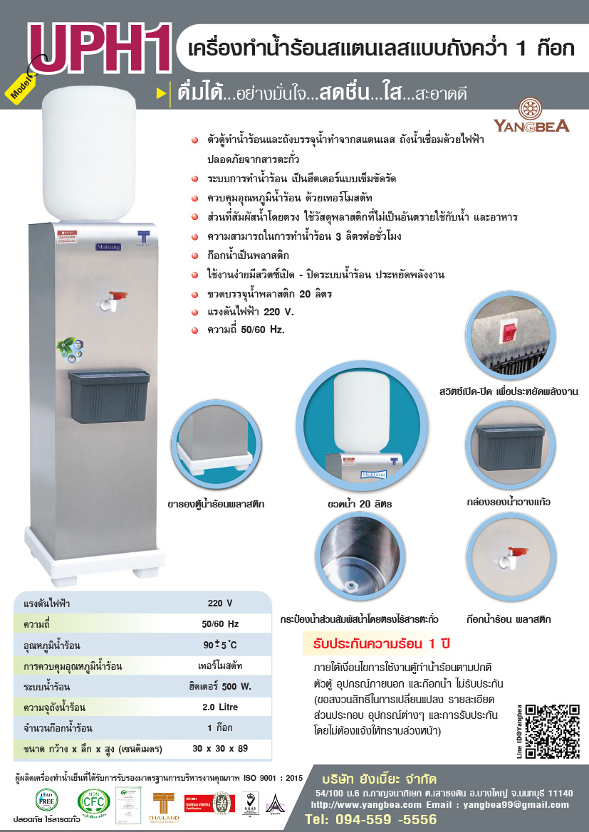 การรับประกัน ตู้น้ำร้อนแบบขวดคว่ำ 1 ก๊อก UPH1 รับประกันความร้อน 1 ปี