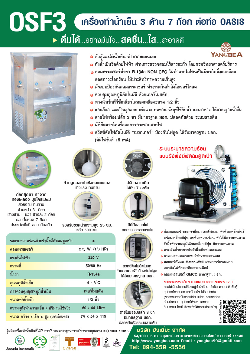 การรับประกัน ตู้ทำนํ้าเย็นสแตนเลส 3 ด้าน 7 ก๊อก OSF3 รับประกันความเย็น 1 ปี COMPRESSOR GMCC รับประกัน 2 ปี