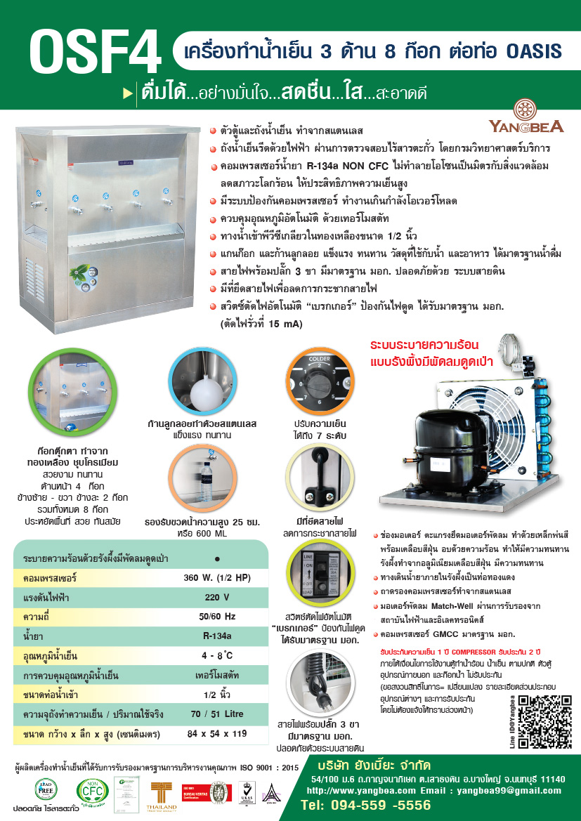 รายละเอียด ตู้ทำนํ้าเย็นสแตนเลส 3 ด้าน 8 ก๊อก OSF4 แบบต่อท่อ ระบายความร้อนด้วยพัดลมดูดเป่ารังผึ้ง