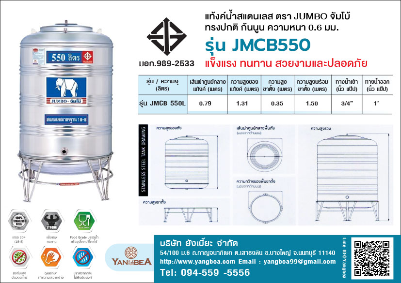 คุณสมบัติ แท้งค์น้ําสแตนเลสตราช้าง(JUMBO)จัมโบ้ ก้นนูน 550 ลิตร รุ่น JMCB550